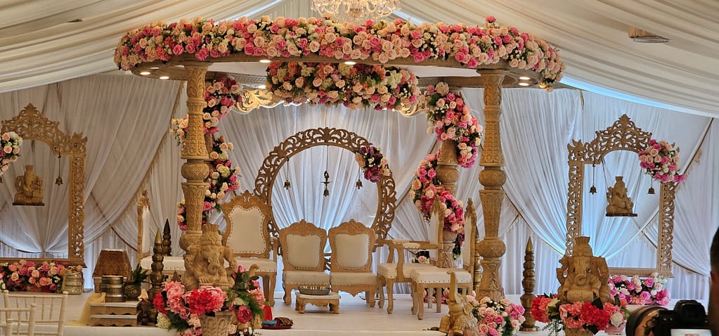 The Milni, the coming together of the Bride and Groom’s families, was held outside the Mansion, beautifully symbolised by the exchange of garlands from Savitaben Mistry. Guests then made their way to the Pavilion, where the ceremony was about to begin.